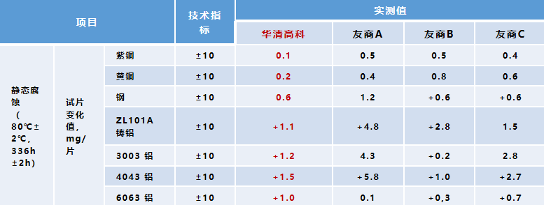 針對標準試片及OEM客戶實際試片對HQ-EV100新能源電動汽車專用冷卻液開展靜態腐蝕和循環臺架腐蝕試驗,試驗后金屬試片變化值均控制在5mg/試片以內,遠低于GB 29743.2要求的10mg/試片限值,其中多種鋁合金的質量變化量遠低于國標上限值。產品不含亞硝酸鹽、硼酸鹽等成分,從源頭守護電池安全。