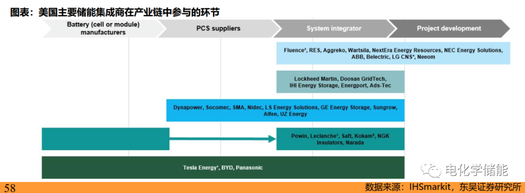 儲能集成商玩家眾多,參與環節有差異化。儲能集成商通常在發電側、電網側、用戶側全線布局,但通過對已有項目、在手訂單拆分,我們認為不同企業仍各有側重,市場呈現差異化競爭態勢。具體可從三側、國內外兩個維度區分。