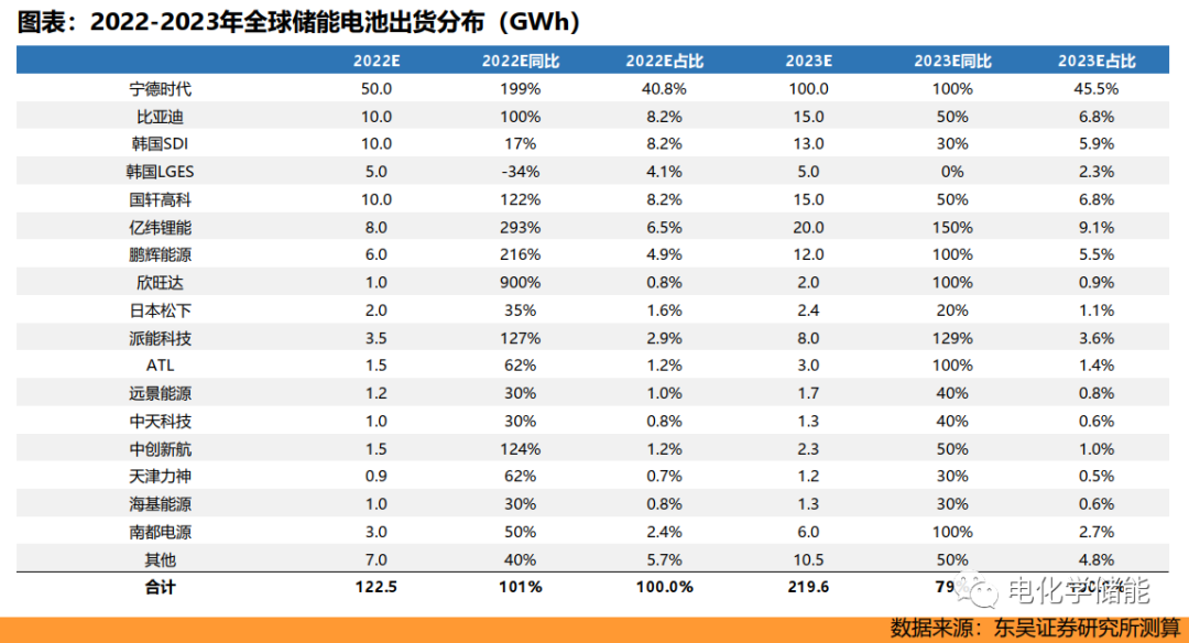 根據測算,預計2022-2023年全球儲能電芯出貨122.5/219.6GWh,同增101\%/79\%;其中,寧德時代作為最大電芯供應商占據榜首,我們預計寧德時代2022-2023年出貨50/100GWh,同增199\%/100\%,占比40.8\%/45.5\%,龍頭地位穩固。