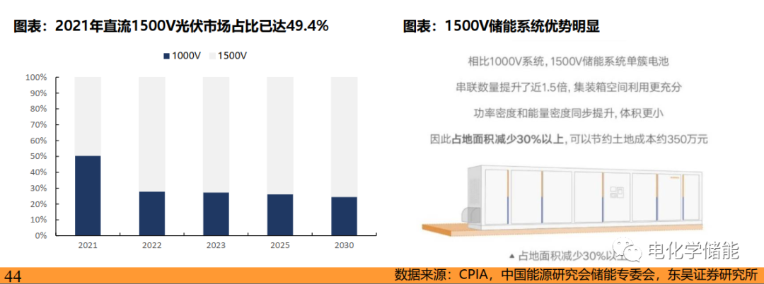 1500V儲能系統優勢明顯,1500V系統核心產品為1500V儲能PCS。1500V儲能系統的能量密度、功率密度將在原來的基礎上可提升35\%+,系統成本降低5\%+,系統效率提高0.3\%+。40尺的集裝箱+280Ah的電芯下,1000V的電池最大裝機容量為3.3MWh,1500V可以提高到4.5MWh,除了PCS、電池、輔助配件成本可以減少外,人工、地基和土地成本也會大幅下降。近期大型項目,1500V滲透率已超過2/3。