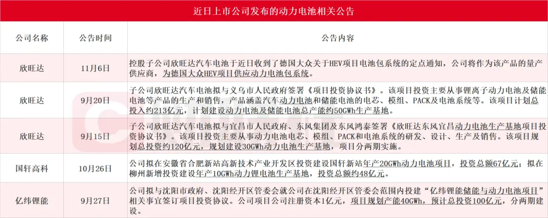二線電池廠商近日動輒大手筆,一擲千金。據財聯社不完全統計,欣旺達先后公告共投資333億元建設生產基地,并將為德國大眾HEV項目供應動力電池包系統;國軒高科和億緯鋰能分別公告擬115億元、100億元投建相關項目。
