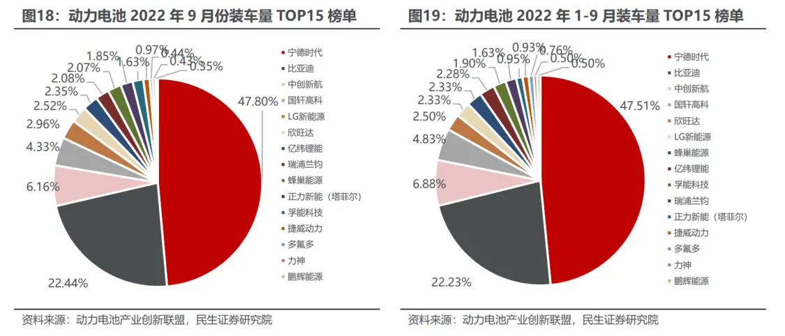 動力電池裝車量9月前十企業中僅有LG新能源1家非國內自主企業,主要為特斯拉中國配套。TOP3(寧德時代、比亞迪、中創新航)累計市場占比共計76.2\%,較8月下降0.05Pcts;二線廠商動力電池裝車量正在加速蓄勢,與Top3差異有所縮小。