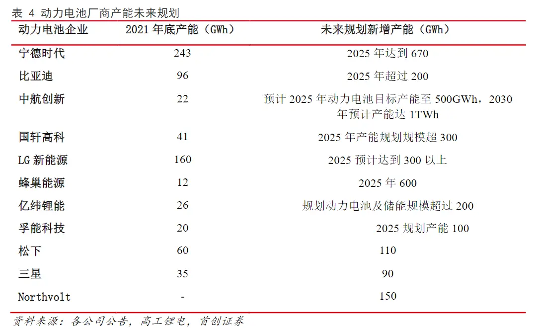 寧德時代已披露產能規劃超過670GWh;比亞迪已公布電池產能規劃超過200GWh;蜂巢能源規劃2025年實現600GWh電池產能,出貨量450GWh;中創新航預計2025年動力電池目標產能至500GWh,2030年預計產能達1TWh;國軒高科、億緯鋰能、孚能科技2025年產能規劃目標分別為300GWh、200 GWh(包括儲能)、100 GWh。