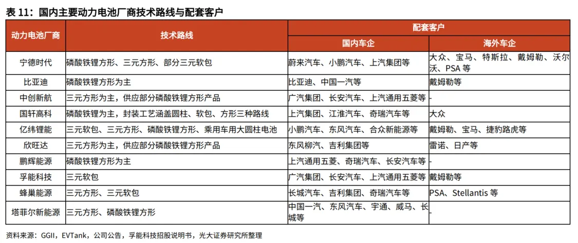 劉凱指出,國內電池廠中,寧德時代同時布局磷酸鐵鋰與高鎳三元,國軒高科、鵬輝能源偏重磷酸鐵鋰,中創新航、孚能科技、欣旺達、蜂巢能源等企業主要側重三元電池,億緯鋰能、塔菲爾新能源布局較為均衡。