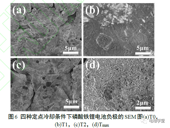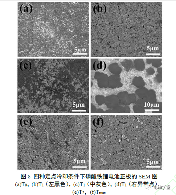 圖8顯示了四種定點冷卻條件下磷酸鐵鋰電池正極的SEM圖。電池開始自發(fā)熱時,電池正極表面可觀察到活性材料顆粒,且表面覆蓋沉積物,推測來自于電解液分解產(chǎn)物。