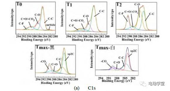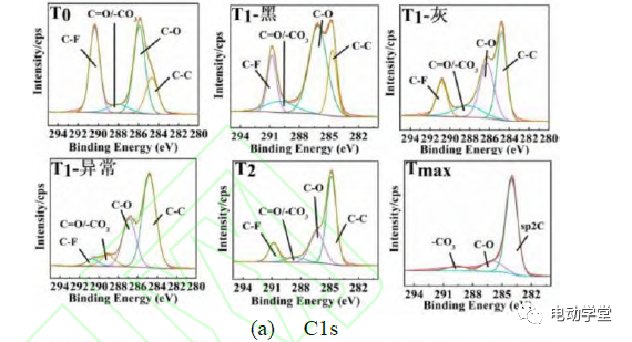 在Tmax狀態(tài)下,正極表面主要存在較厚的界面膜、石墨化的C-C、-CO3、C-F等物質(zhì)。由此可知,磷酸鐵鋰正極和負極均在T0狀態(tài)下疑似已經(jīng)發(fā)生了副反應(yīng),但相比于負極材料,正極材料在熱失控狀態(tài)下安全性更加穩(wěn)定,這也和磷酸鐵鋰材料本身特性有關(guān)。