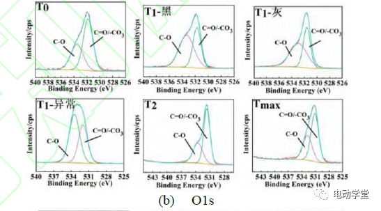 圖7(b)為四種定點冷卻條件下磷酸鐵鋰電池負極的O1sXPS圖譜。在溫度達到T0時,負極表面的O存在C=O、-CO3、C-O三種形式,其中,C-O代表著PEO低聚物的生成;C=O代表ROCO2Li、Li2CO3等烷基鋰碳酸鹽的存在。