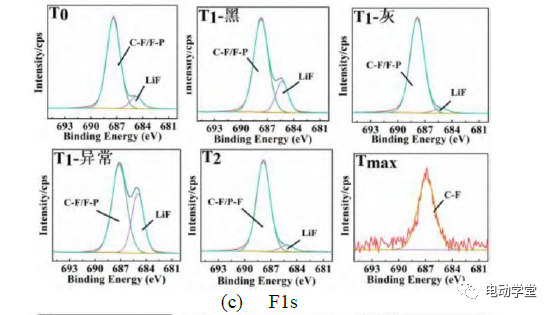 圖7(c)為四種定點冷卻條件下磷酸鐵鋰電池負極的F1sXPS圖譜。在溫度達到T0時,負極表面的F存在C-F、F-P、LiF三種形式,其中,C-F代表著含氟有機物的生成;F-P代表殘留電解質(zhì)鹽LiPF6的存在以及相應(yīng)分解產(chǎn)物PFx的存在。