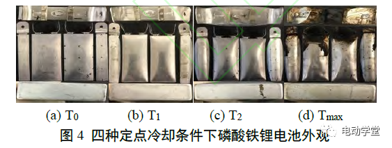 圖4顯示了四種定點冷卻條件下磷酸鐵鋰電池的外觀。可以發(fā)現(xiàn),隨著熱失控過程的進行,磷酸鐵鋰電池鼓脹程度逐漸加劇,電池熱失控結(jié)束后盡管外包裝仍然存在,但有明顯燒蝕現(xiàn)象。電池泄壓閥打開后,大量電池燃燒產(chǎn)物附著在殼體外部。