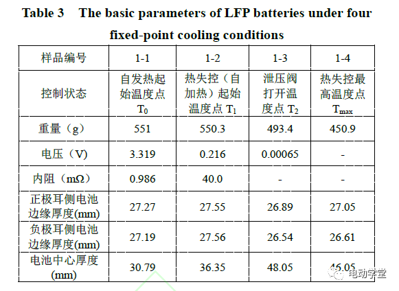 對比四種條件下的磷酸鐵鋰電池基本參數(shù),如表3所示。可知,隨著絕熱熱失控的進行,電池重量逐漸降低,內(nèi)阻逐漸增加,中心厚度有明顯增長,開路電壓逐漸降低,且在達到熱失控溫度點后電池電壓急劇降低至0V。