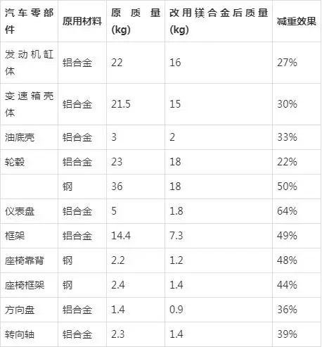 一、汽車不同零部件使用鎂合金后減重效果