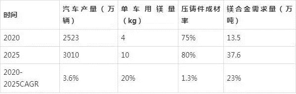 綜上所述,根據上述汽車不同部位零部件通過鎂合金進行輕量化后減重效果及其這些部件的重量,可以預測到2025年我國單車用鎂量有望提高至10kg,并且假設2025年汽車銷量達到3000萬輛,汽車領域鎂合金需求將達到37.6萬噸,相比2020年CAGR為23%。