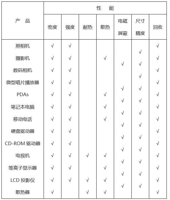 鎂合金具有密度小、比強度和比剛度高、優(yōu)良的耐沖擊性能等優(yōu)點,因此成為制作電子器件殼體的理想材料之一。下表列出了各種外殼材料的性能對比:
