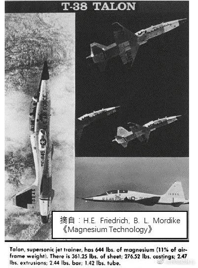 從鎂合金應(yīng)用歷史上看,在二戰(zhàn)期間,大量的鎂合金應(yīng)用在戰(zhàn)機(jī)上。比如圖示的T-38戰(zhàn)斗機(jī)使用了292.11kg的鎂合金,60%的鎂合金板材,43%的鑄造鎂合金。