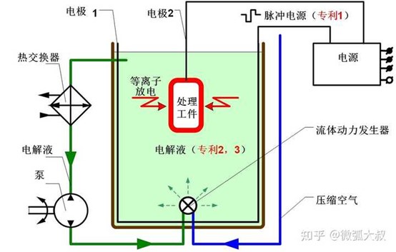 微弧氧化(Micro-arcOxidation,MAO),又稱微等離子體氧化(Micro-plasmaOxidation,MPO)、陽(yáng)極火花沉積(Anode Spark Deposition,ASD)、等離子體增 強(qiáng)電化學(xué)表面陶瓷化(Plasma Enhance Electrochemical Surface Ceramic coating, PECC)等技術(shù),是一種鋁、鎂、鈦及其合金表面在電解液中依賴外加電場(chǎng)使其表 面原位反應(yīng)生成自身金屬氧化物的新技術(shù)。圖 1 是微弧氧化設(shè)備結(jié)構(gòu)示意圖,從 圖中可以看出將鋁、鎂合金制品做陽(yáng)極,不銹鋼做陰極,置于脈沖電場(chǎng)環(huán)境的電 解液中,樣品表面因受端電壓作用而發(fā)生等離子體放電,所產(chǎn)生的高溫高壓條件使微區(qū)的鋁、鎂原子與溶液中的氧結(jié)合生成與基體以冶金方式結(jié)合的氧化鋁或氧化鎂陶瓷層。