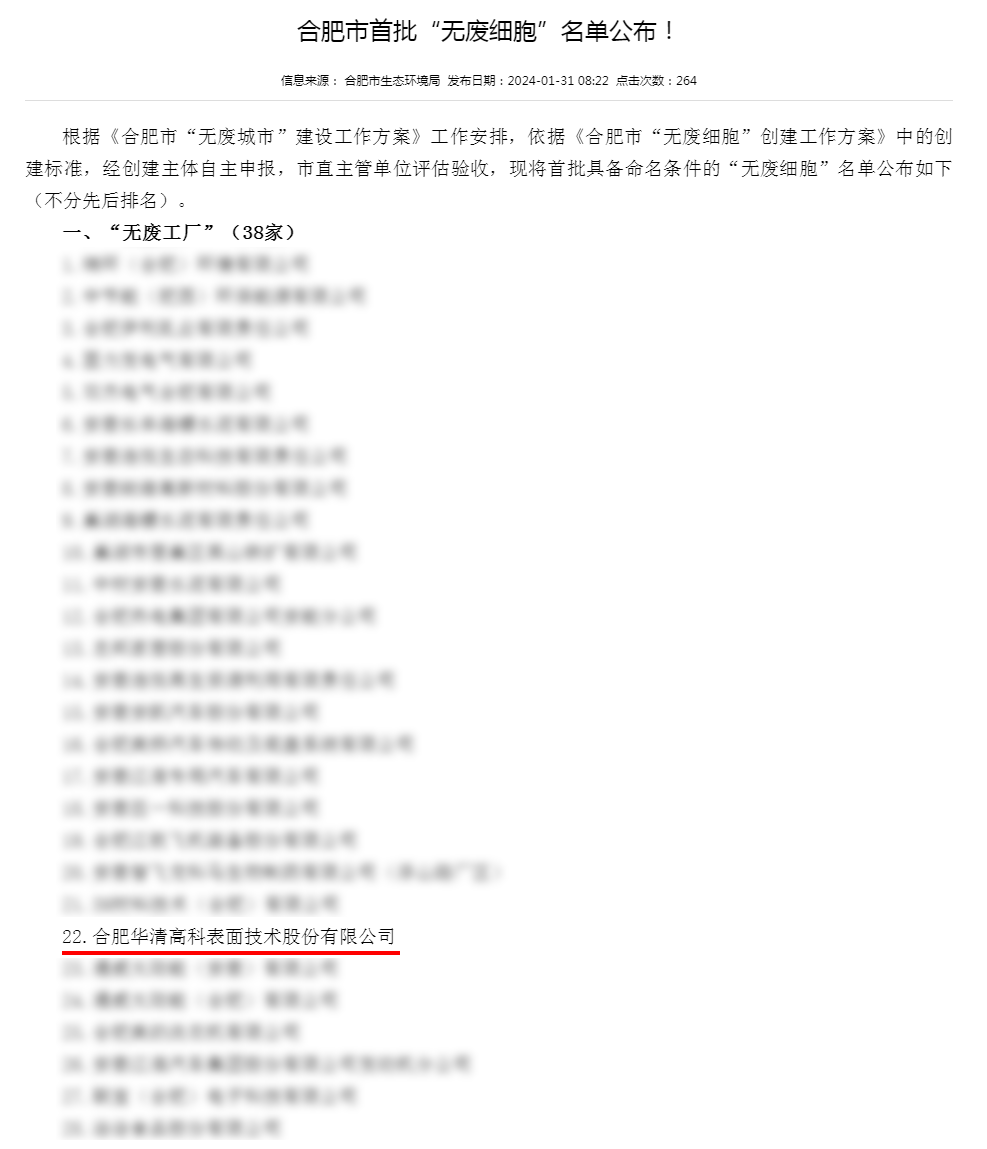 根據(jù)《合肥市“無廢城市”建設(shè)工作方案》工作安排,依據(jù)《合肥市“無廢細(xì)胞”創(chuàng)建工作方案》中的創(chuàng)建標(biāo)準(zhǔn),經(jīng)創(chuàng)建主體自主申報(bào)及市直主管單位評估驗(yàn)收后,1月31日,合肥市生態(tài)環(huán)境局公布首批“無廢細(xì)胞”名單,合肥華清高科表面技術(shù)股份有限公司獲評“無廢工廠”稱號。