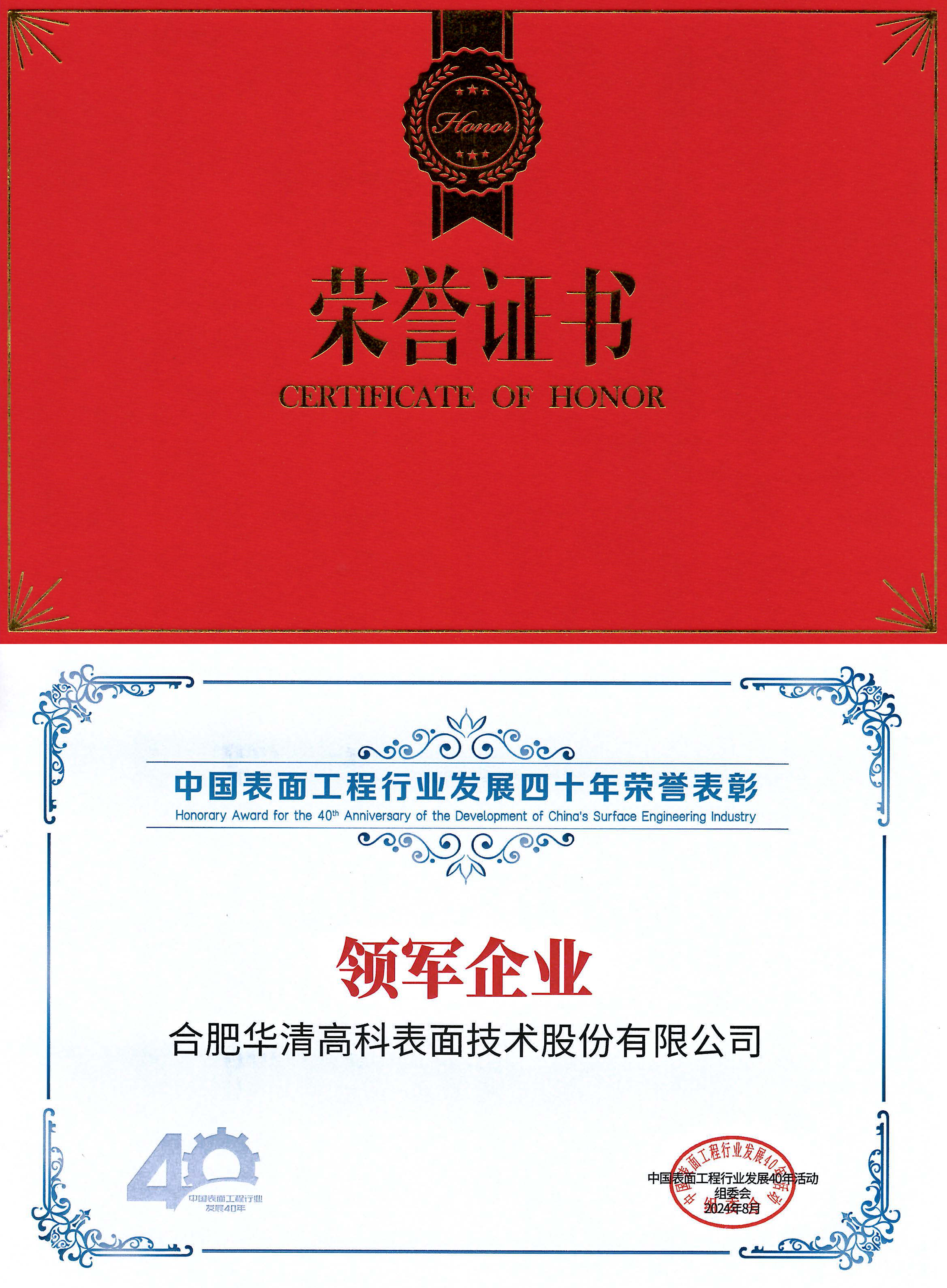 中國(guó)表面工程行業(yè)發(fā)展四十年組委會(huì)對(duì)合肥華清高科表面技術(shù)股份有限公司及公司董事長(zhǎng)劉萬(wàn)青個(gè)人的表彰,充分體現(xiàn)了對(duì)合肥華清高科表面技術(shù)股份有限公司在表面工程領(lǐng)域的肯定,以及對(duì)董事長(zhǎng)劉萬(wàn)青在行業(yè)中鉆研不懈、躬行實(shí)踐的高度認(rèn)可。